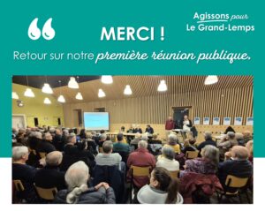 🙏MERCI ! Nous étions plus de 80 participants réunis hier soir pour la première réunion publique d’Agissons pour Le Grand-Lemps… et ça nous boost énormément !💬 Des idées, des échanges, des débats riches et constructifs…👉 Un projet qui se construit avec vous et pour vous. Cette soirée a été l’occasion de vous présenter : 📅 … Lire la suite de Retour sur la première réunion publique